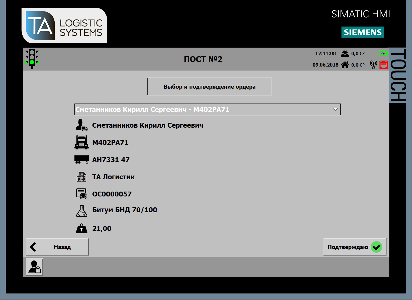 Автоматизированная система управления разгрузкой битумных материалов из операторской посредством сенсорной панели Siemens.